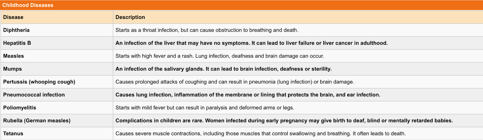 Every child should be immunised against these ten potentially dangerous childhood diseases: