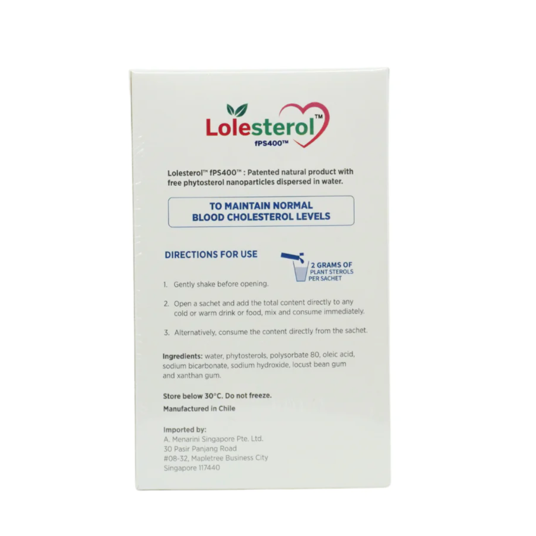 Lolesterol is a unique, patented and clinically tested technology; a simple combination of plant sterols and water. 2 grams of plant sterols per sachet as per recommendation by MOH to maintain healthy cholesterol level.